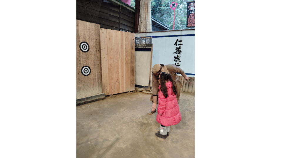 本物の鉄製の手裏剣(結構ずっしりと重いです!)を木の的に向かって投げられる貴重な体験なんですが、ここも人気のため行列ができやすいポイントです。