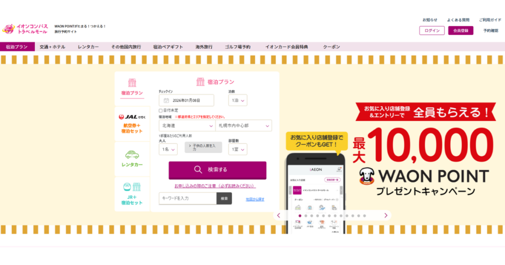 「旅行のためにわざわざ新しいサイトに登録するのは面倒」という方でも、いつものイオンカードとお買い物ついでに予約ができる手軽さは魅力的ですよね。